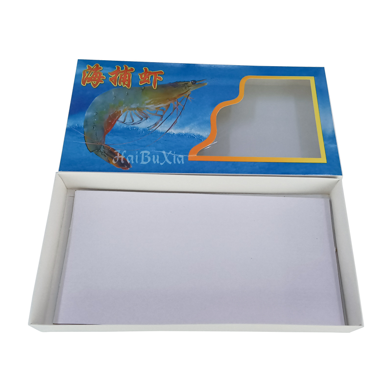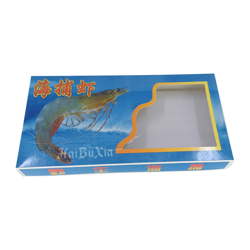 海虾透明开窗包装盒采用覆膜工艺将盒子变得防油防水,可以放冻虾鲜虾等,纸质包装可以回收,绿色环保,支持定制,免费设计