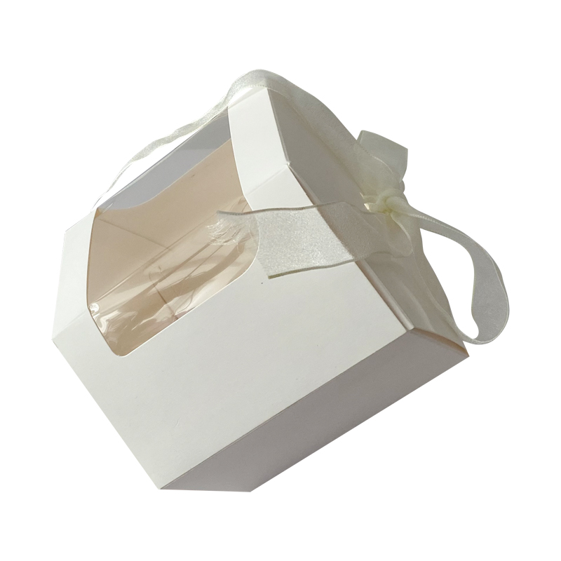纱状丝带简约开窗蛋糕盒搭配白色纱状丝带,让盒子看起来更加唯美,仙气飘飘,正面是一个三面的透明窗,可以清楚的看到内部产品,支持定制免费设计