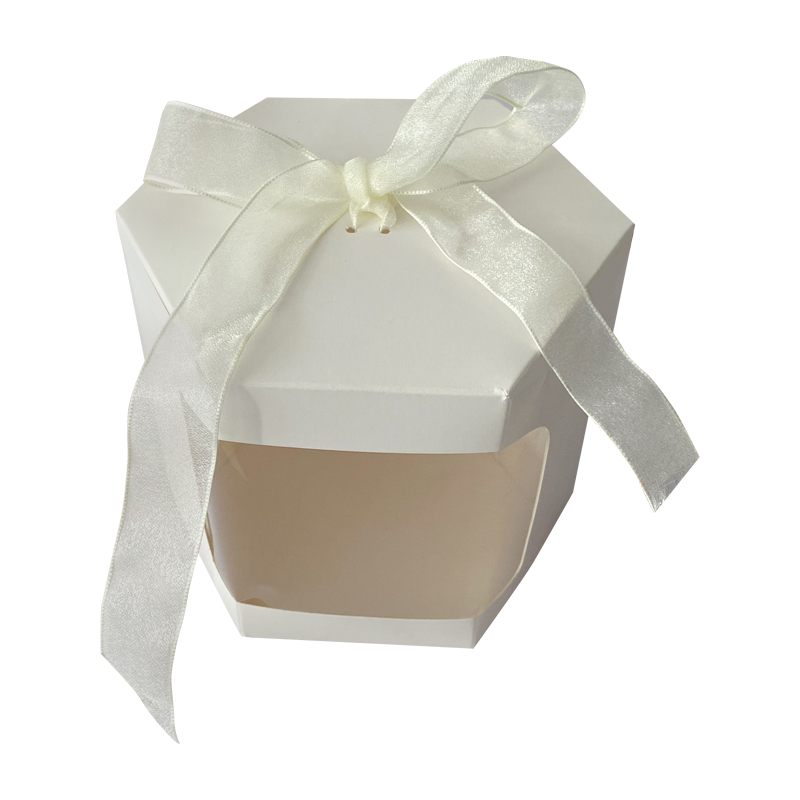 搭配白色纱状丝带,让盒子看起来更加唯美,仙气飘飘,正面是一个三面的透明窗,可以清楚的看到内部产品,支持定制免费设计