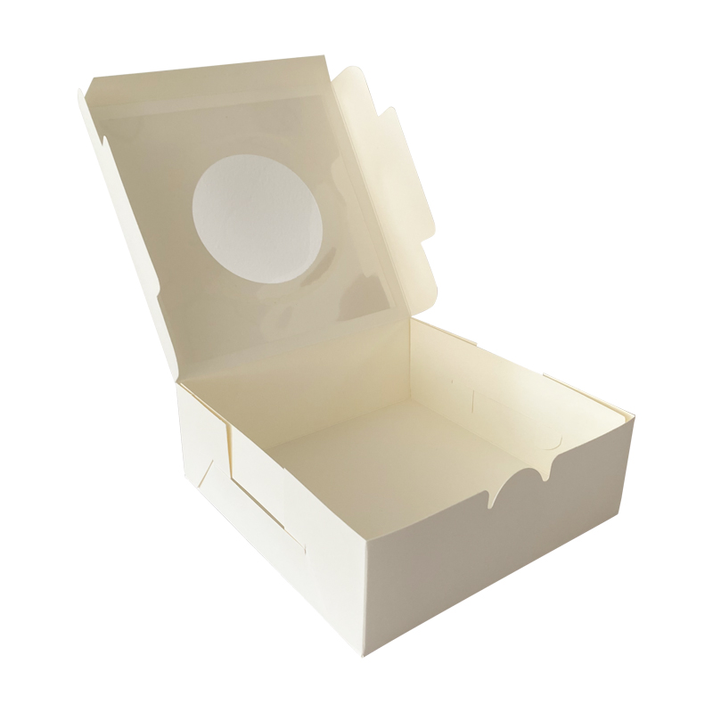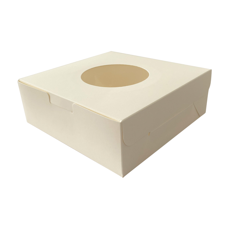 圆窗设计白色纸质蛋糕盒淡淡黄色的纸制作,透着暖色,材质厚实耐用,食品级材质,支持定制免费设计,可折叠使用,节约运输空间降低运输成本,欢迎随时来联系我们