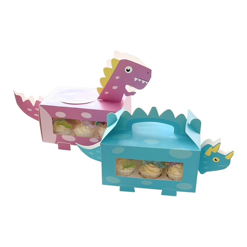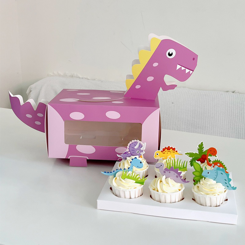这款卡通的小恐龙蛋糕盒,印刷裁切可爱有趣,内部托盘可以放六个纸杯蛋糕,盒子可以折叠使用,节约存储运输空间,支持定制免费设计