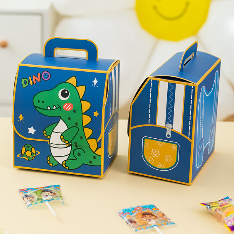 这是一款卡通的纸质包装盒,是一个小书包的形状,正面印刷恐龙/小女孩图案,有趣又多用,可以用来装各种小零食,可以折叠,支持定制免费设计