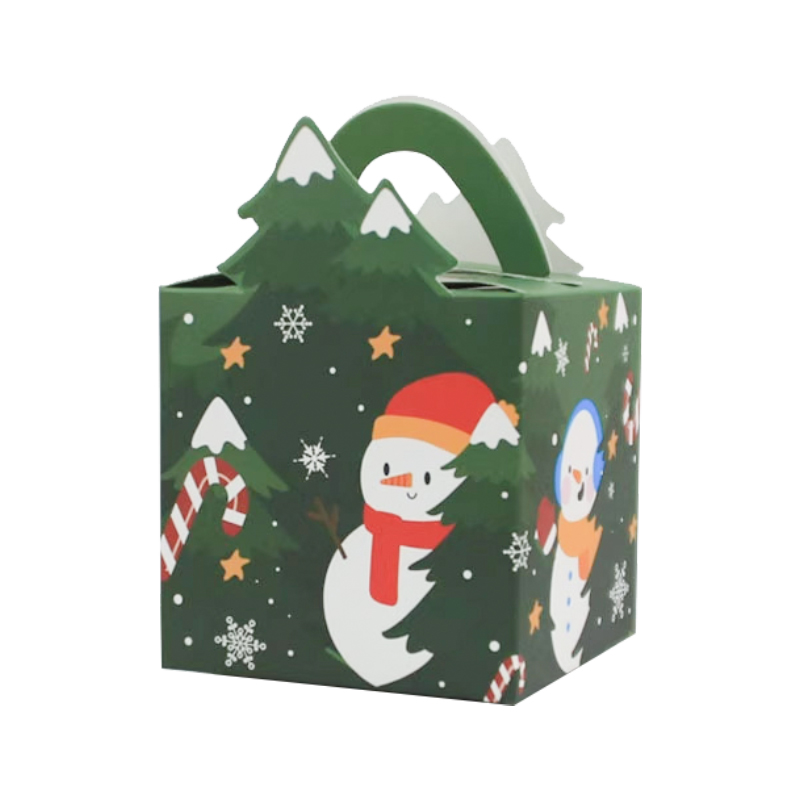 小雪人手提卡纸蛋糕盒圣诞节日礼盒这款采用卡纸制作的手提蛋糕盒,表面印刷了不同的卡通图案,印刷清晰细腻准确,顶部带有把手方便携带使用,支持定制免费设计