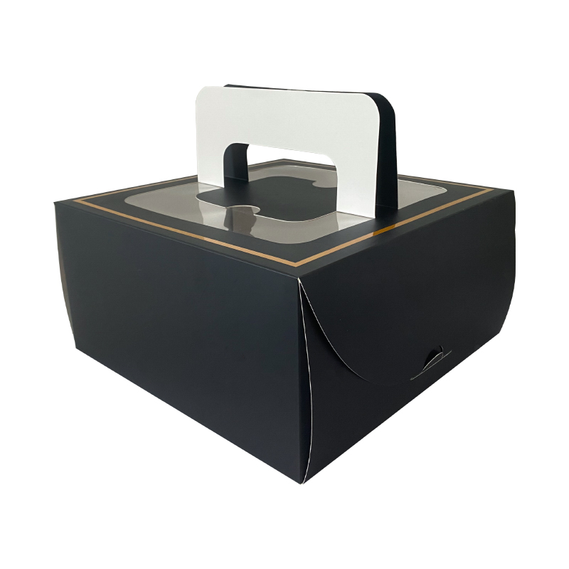 手提黑色蛋糕盒带纸托可折叠定制这是一款黑色的侧边插口的蛋糕盒,尺寸较大,可以放下八寸的蛋糕,内部带有瓦楞纸托,增加盒子的承重能力,顶部带有把手,方便携带使用,支持定制免费设计