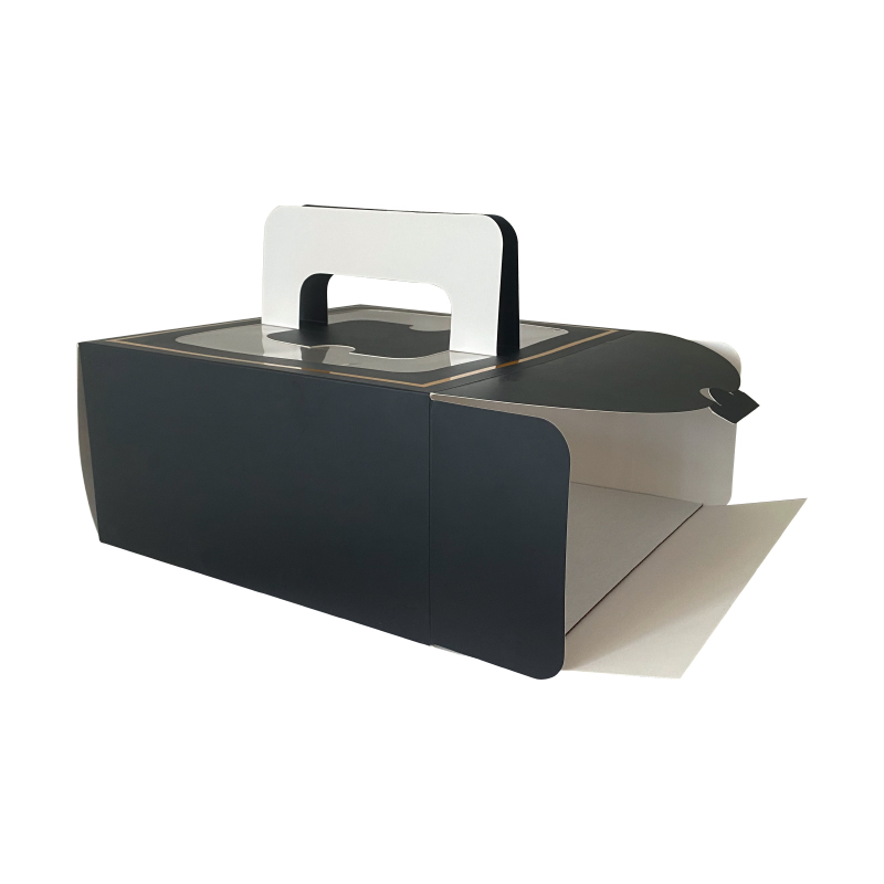 这是一款黑色的侧边插口的蛋糕盒,尺寸较大,可以放下八寸的蛋糕,内部带有瓦楞纸托,增加盒子的承重能力,顶部带有把手,方便携带使用,支持定制免费设计