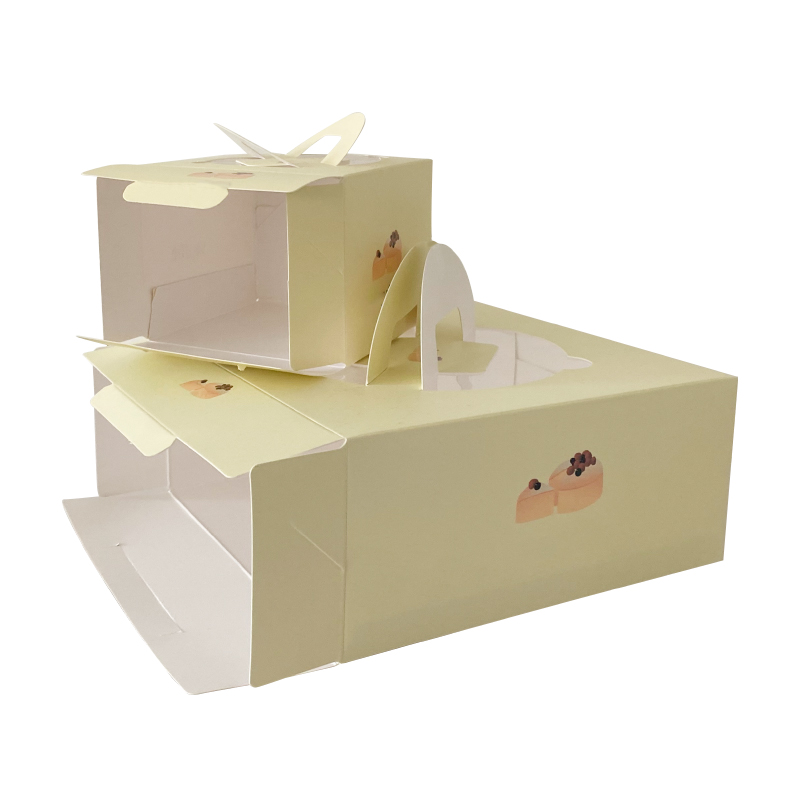 这是一款客户定制的纸质手提蛋糕盒,表面印刷卡通图案,色彩温柔细腻,让盒子看起来更加漂亮,增加产品的食欲,顶部带有透明窗设计,可以看到内部产品状态,支持定制免费设计