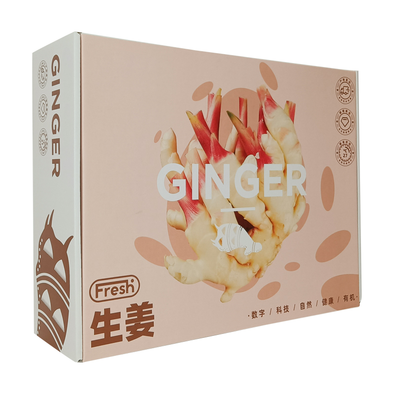 这是一款生姜农产品包装盒,是飞机盒盒型,此盒型常用于快递产品打包,承重能力强,可以展开变成一片纸,可以很好的节约运输空间,折叠方便使用简单,支持定制免费设计