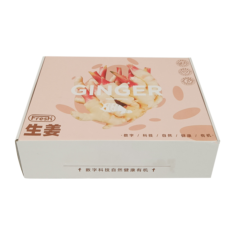 生姜农产品纸质包装盒这是一款生姜农产品包装盒,是飞机盒盒型,此盒型常用于快递产品打包,承重能力强,可以展开变成一片纸,可以很好的节约运输空间,折叠方便使用简单,支持定制免费设计