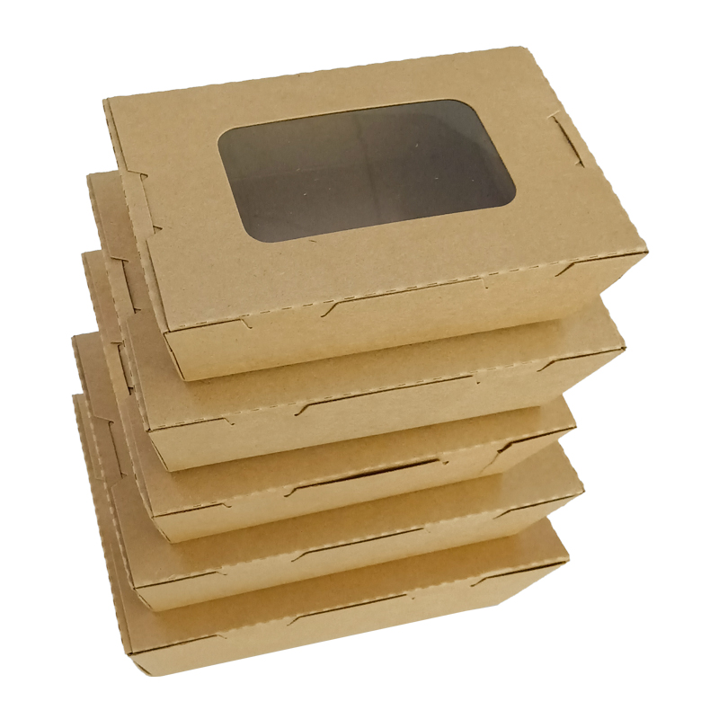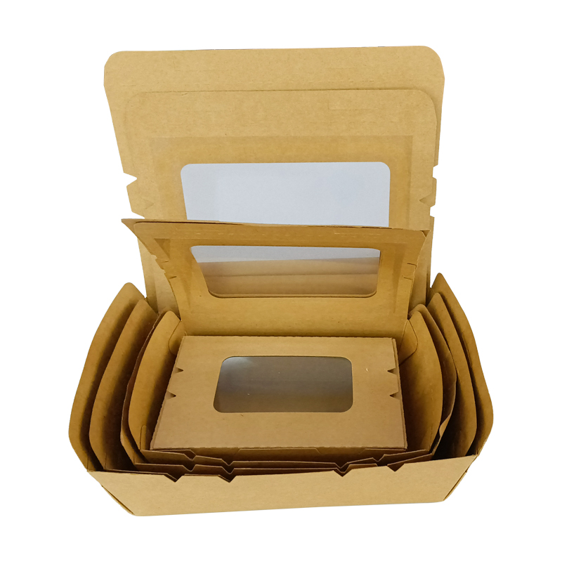 开窗可折叠牛皮纸打包外卖餐盒这是有透明开窗的款式,可以让客户更方便的看到内部产品,可以装一些沙拉、水果切块等,价格便宜,好用,支持定制,免费设计