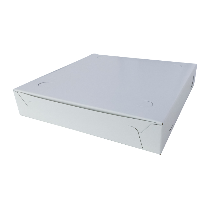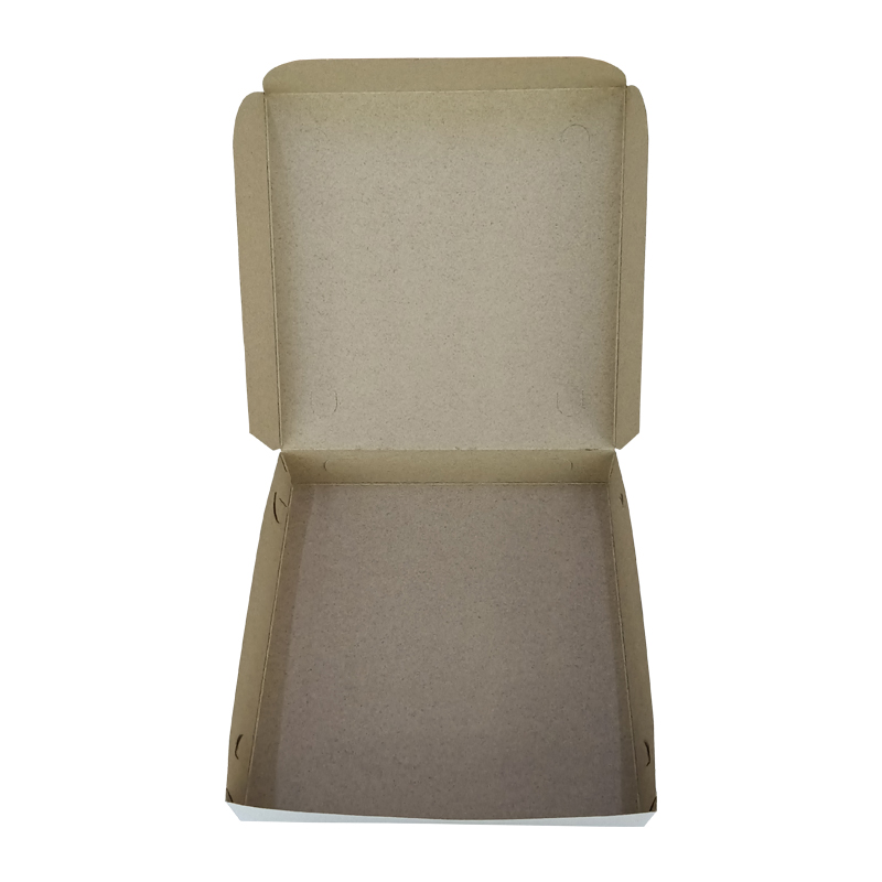 灰底白卡单层披萨糕点盒简单一体成型,只需要简单的折叠就可以使用,展开是一页纸,运输时节约空间,降低运输成本,支持定制,免费设计