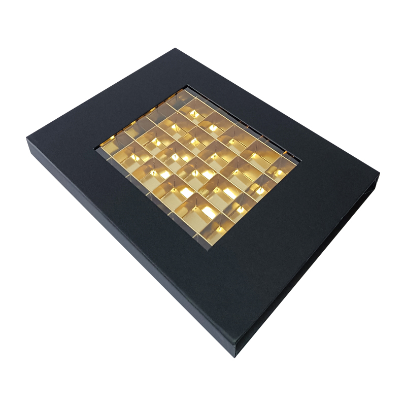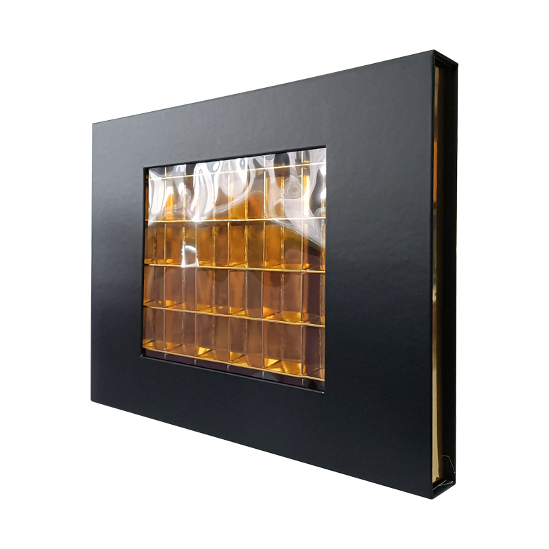 表面贴黑色的磨砂纸,平整无起鼓,内部搭配金色的纸,让盒子看起来更加高档,可以放48个巧克力或者其他甜点,支持定制免费设计