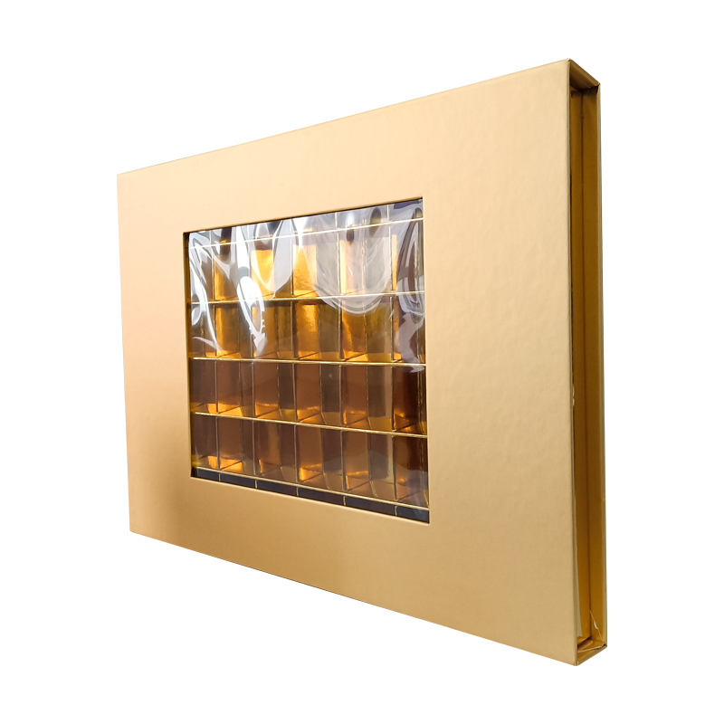 内外一致金色的巧克力盒,可以装48个巧克力或者其他的甜品,内部的隔断可以拆卸,书型盒侧边有两个磁吸卡扣,方便使用,不可折叠,支持定制免费设计