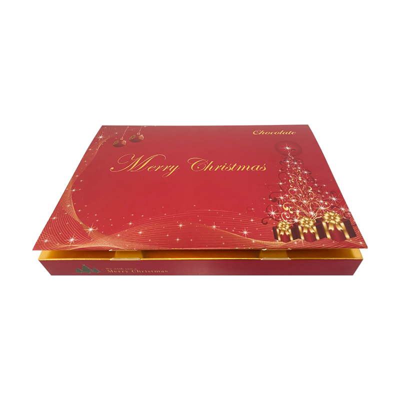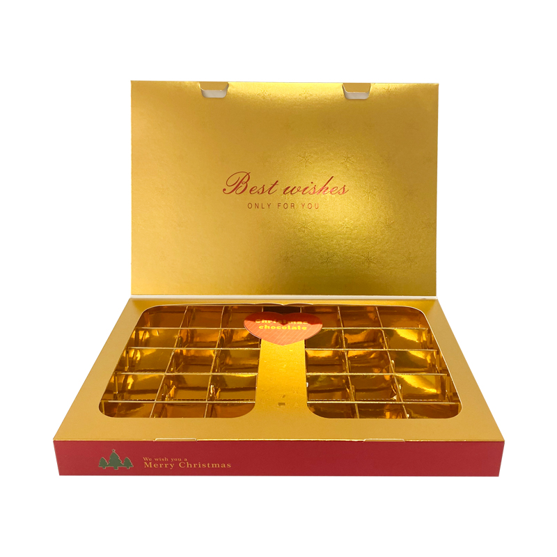 特种纸金卡烫红金巧克力盒圣诞限定这是一款圣诞节日的巧克力盒,采用特种金卡纸制作,内侧烫红金工艺,内部可以放35个巧克力,盒子从侧边可以打开,是一个书型盒的款式,可以折叠使用,支持定制免费设计