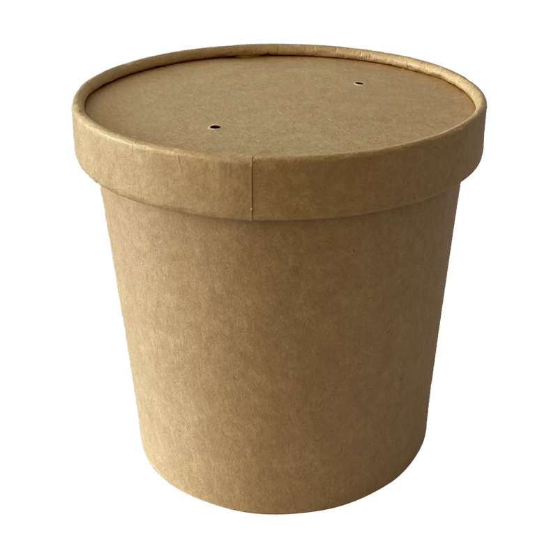 粥碗外卖汤桶一次性牛皮纸餐盒汤桶的盖子上有四个小洞,方便透气的同时不会掉入异物,双重保护,内部防油防水,食品级材质,盒子整体结实耐用,不漏汤耐高温,支持定制免费设计