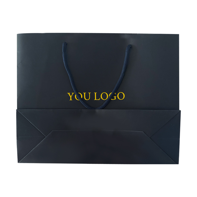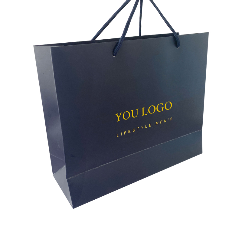 这款纸袋是客户定制的用于男装店,表面印刷黑色,烫金logo,彰显产品定位,材质厚实耐用,可以折叠方便运输,支持定制免费设计