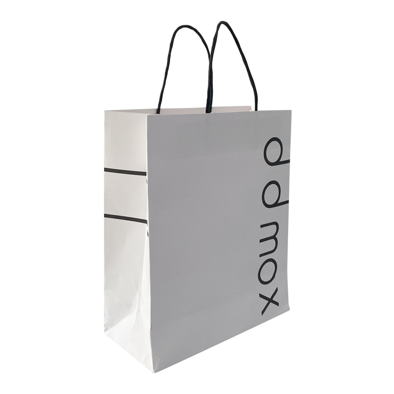 白色手提纸袋黑色细绳把手纸袋这款纸袋表面印刷定制内容,设计风格简约,搭配同样是黑色的手提绳,粘合处结实,承重能力强,可以用来装很多东西,多次循环利用,支持定制免费设计