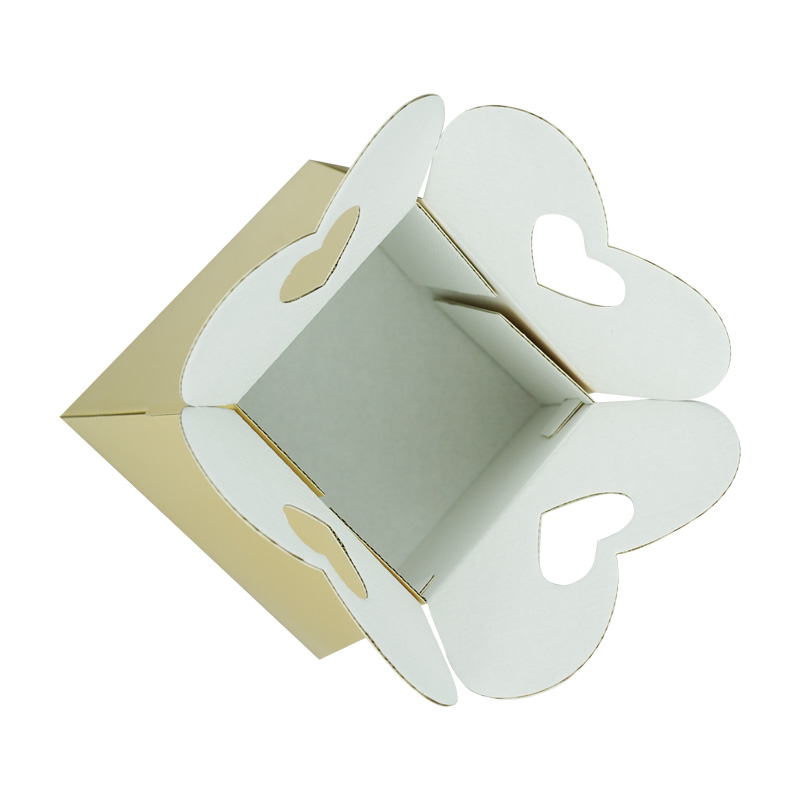 自创心形黄色花盒顶部是心形和镂空设计,可以很好的支持花束的直立,让花朵展示的更漂亮方便,纸质材质可回收使用,支持定制免费设计