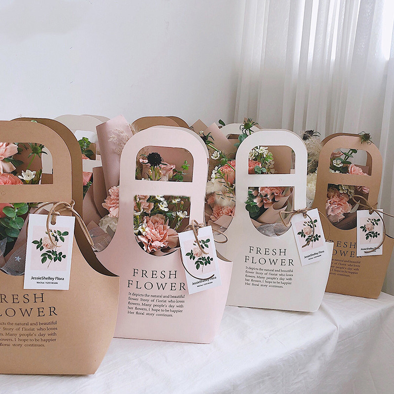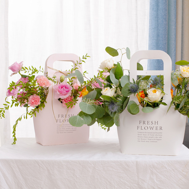 韩式花艺包装袋摄影道具花盒简约印花手提花篮,内层覆膜结实耐用,采用卡纸牛皮纸制作,多种颜色可选,支持定制免费设计,带有把手方便携带,欢迎随时联系我们