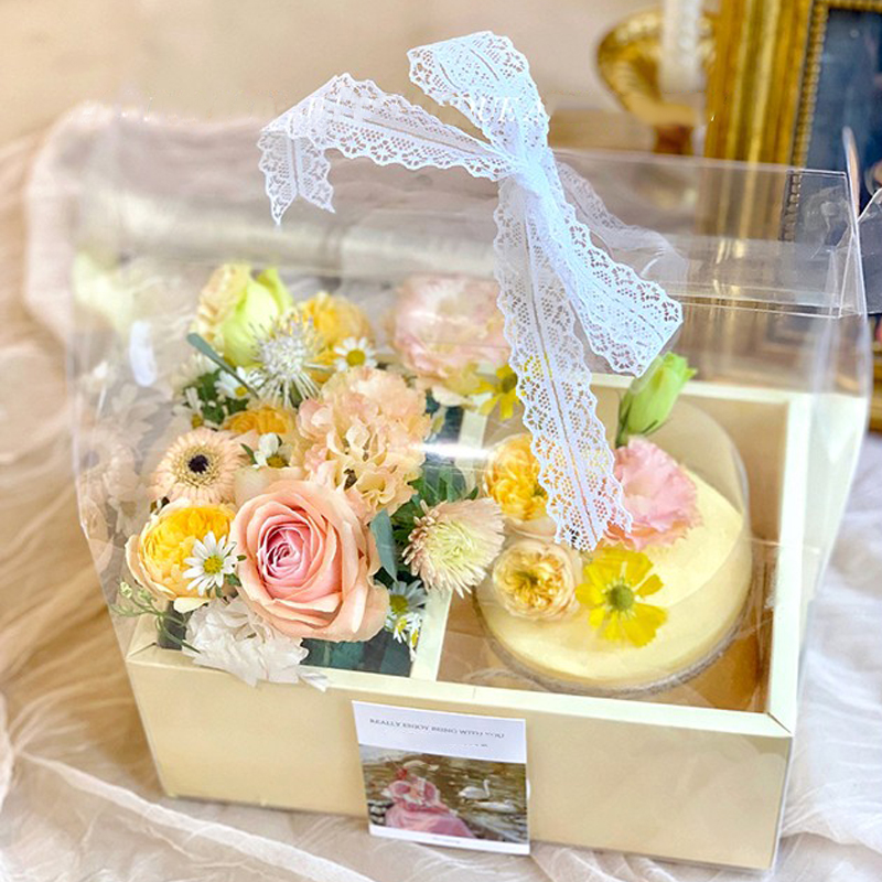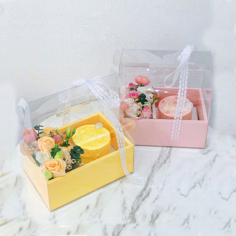 手提pvc透明花盒蛋糕烘焙diy插花盒搭配pvc材质的外壳,透明且好看,内部托盘是纸质材质,食品材质使用放心,可以直接接触食物,没有异味,支持定制免费设计