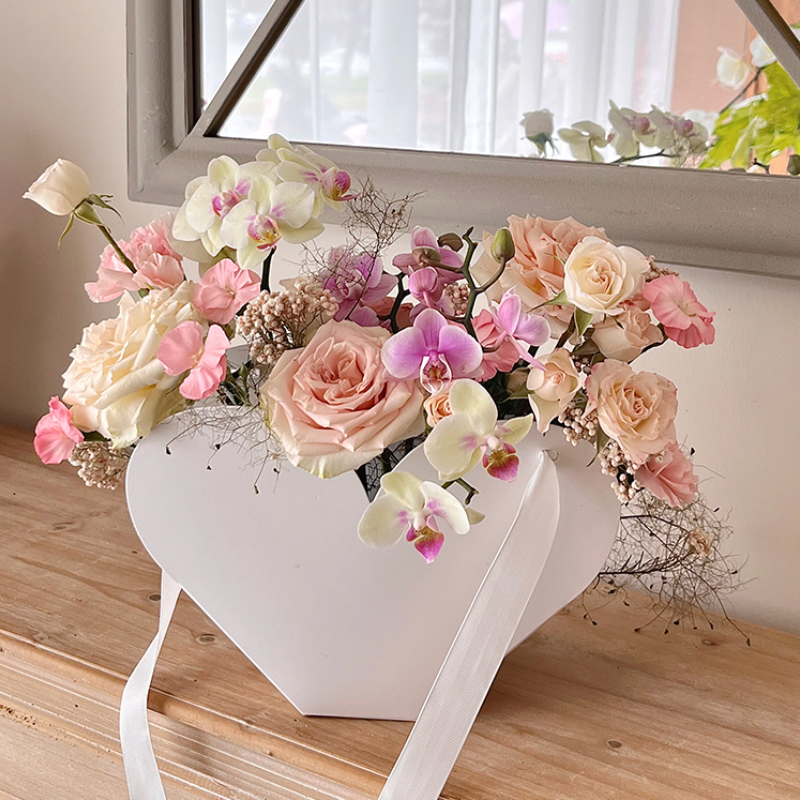 手提心形花盒卡纸情人节花束包装盒这是一款采用卡纸制作的心形花盒,盒子可以折叠使用,搭配丝带把手方便携带使用,表面无印刷,是一款通用产品,支持定制免费设计
