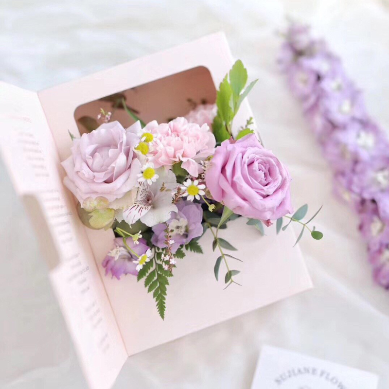 这是一款书型盒,翻盖设计,内侧掏空可用来插花,也可以用来装其他的礼物,盒子的下半部分可以用来写祝福语,支持定制免费设计