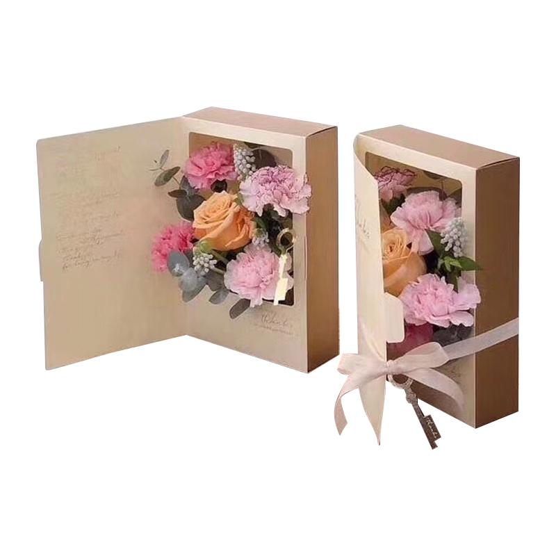 教师节花束包装盒鲜花卡纸书型盒定做这是一款书型盒,翻盖设计,内侧掏空可用来插花,也可以用来装其他的礼物,盒子的下半部分可以用来写祝福语,支持定制免费设计