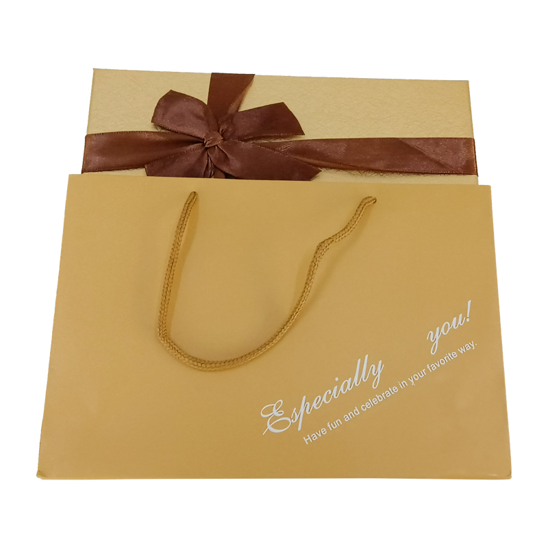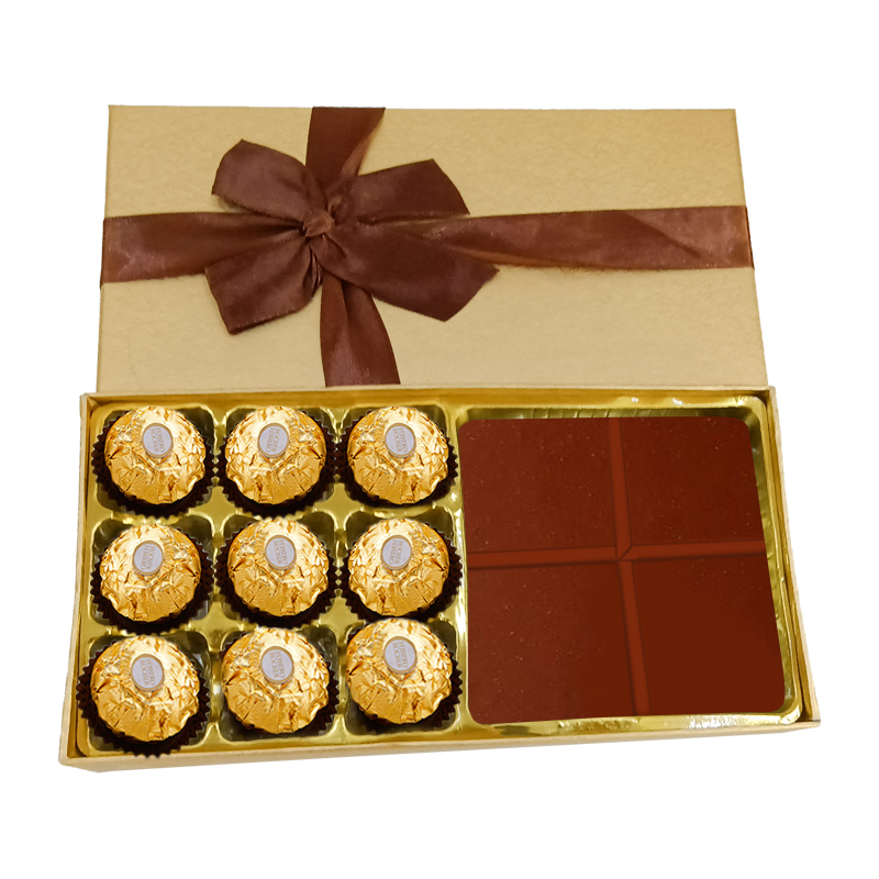 金色纸盒搭配棕色的丝带蝴蝶结,让盒子看起来更加高档漂亮,内嵌采用不对称款式,可以放两种不同的巧克力形状,支持定制,免费设计