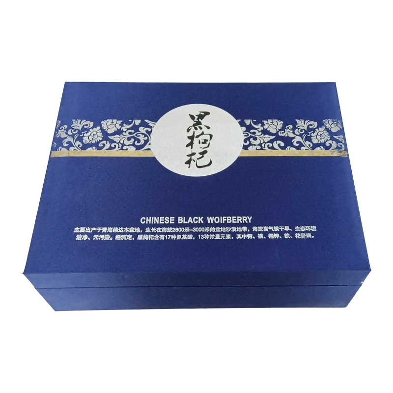 黑枸杞蓝色特种纸包装礼盒logo采用烫银工艺,在光下清晰引人注意,蓝色的纸彰显产品的与众不同,内嵌采用金黄色的丝绸缎,更加衬托产品的高档,支持定制,免费设计