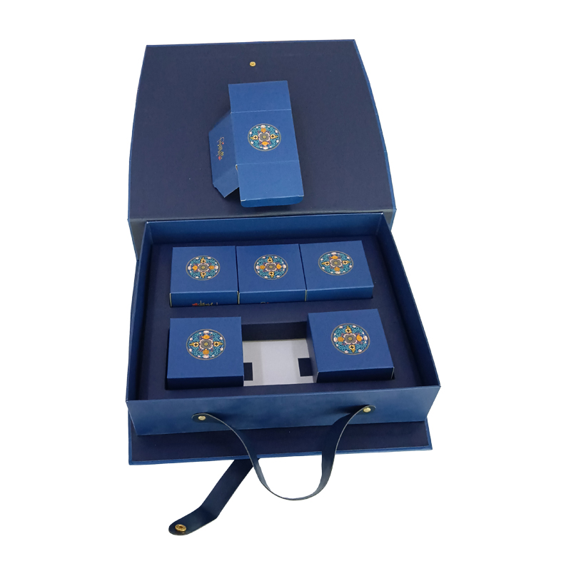 内部使用翻盖插底小盒子,表面印刷宝石色花纹,金属扣与皮质手提带,尽显华贵高档,全套可定制,免费设计,欢迎随时联系我们