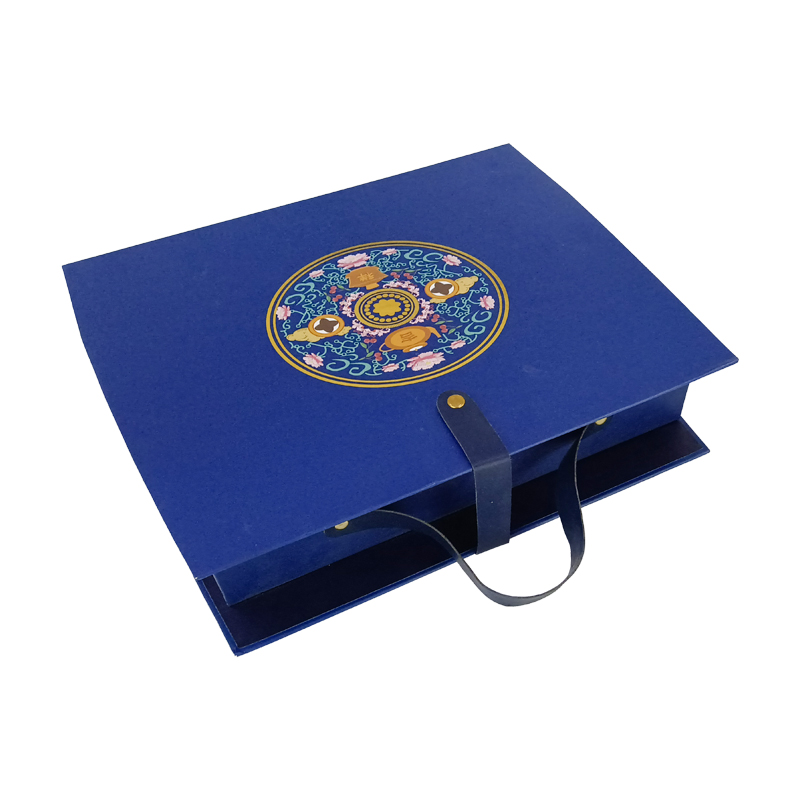 皮带手提藏蓝宝石色花纹礼盒内部使用翻盖插底小盒子,表面印刷宝石色花纹,金属扣与皮质手提带,尽显华贵高档,全套可定制,免费设计,欢迎随时联系我们