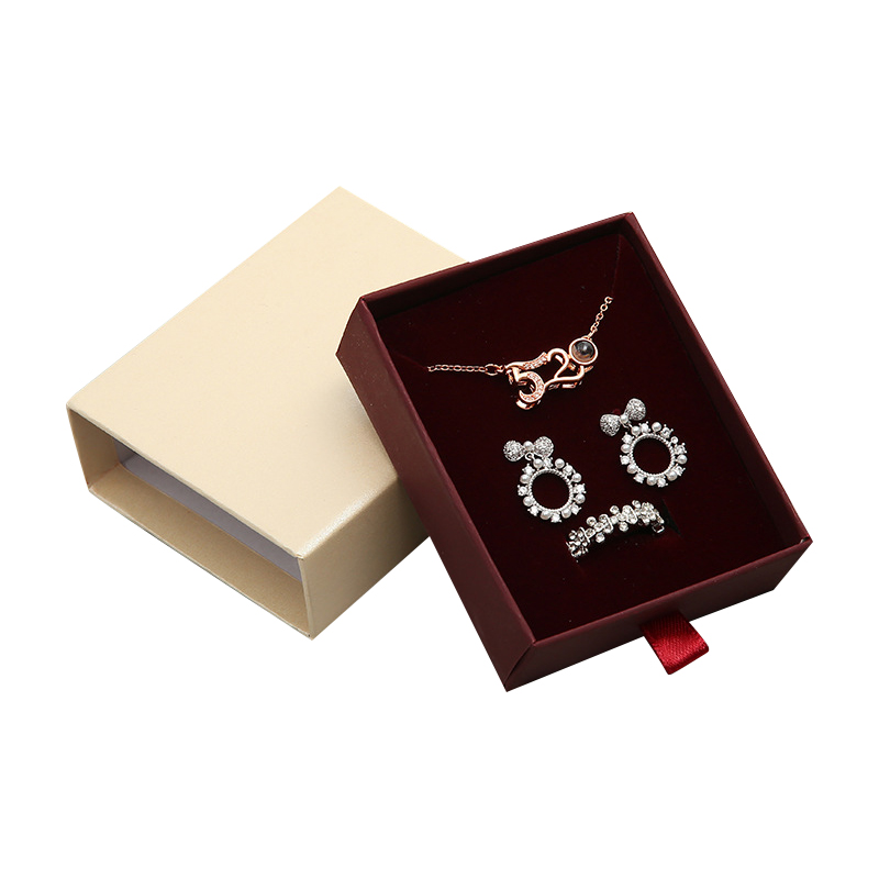 丝绒戒指项链包装礼盒可以根据产品的需求定制尺寸以及形状,抽拉的盒子方便使用,材质厚实耐用,内部的嵌套可以更好的衬托产品,欢迎随时联系我们