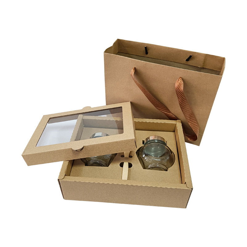 茶叶套装玻璃瓶牛皮纸礼盒这款套装礼盒,内部有防尘盖,可以减少灰尘,内部是纸质嵌套固定玻璃瓶与木勺,减少产品晃动,搭配手提袋方便携带,支持定制免费设计