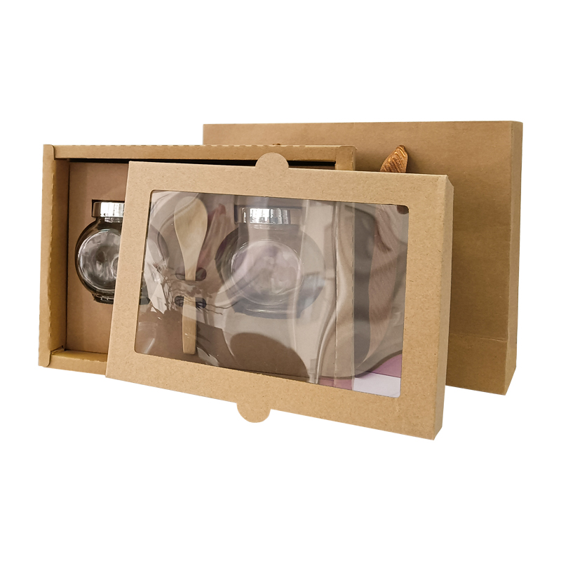 这款套装礼盒,内部有防尘盖,可以减少灰尘,内部是纸质嵌套固定玻璃瓶与木勺,减少产品晃动,搭配手提袋方便携带,支持定制免费设计
