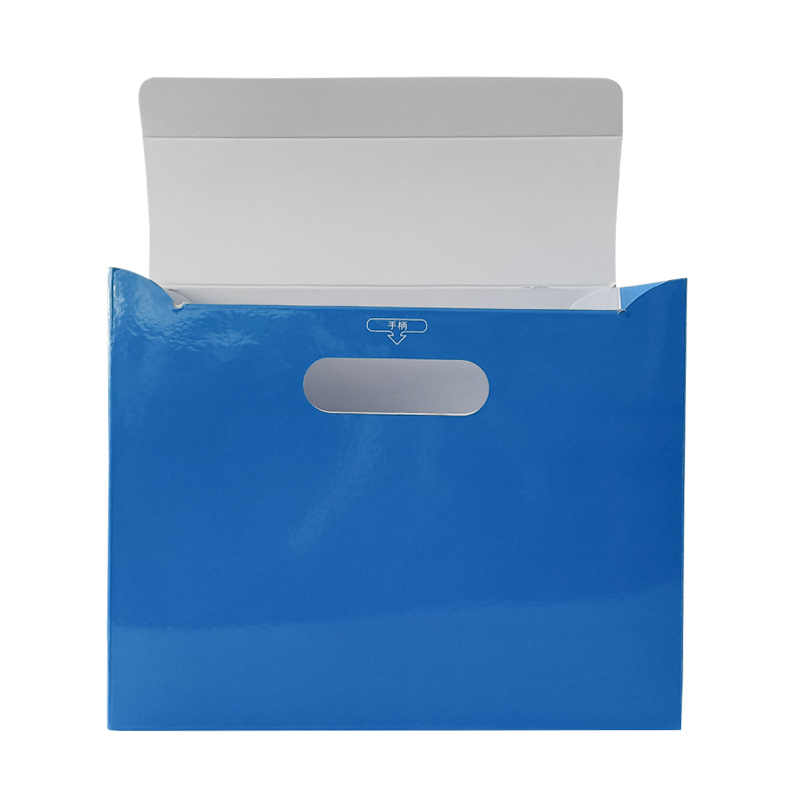 文件箱蓝色瓦楞整理信件收集箱这是一款定制的文件收纳箱,正面有空把手,可以方便的拿起放下移动等操作,可以折叠,减少运输空间的占用,扣底承重能力强,支持定制免费设计