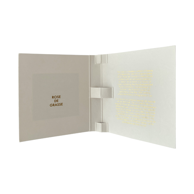 香水小样包装卡扣纸试香卡纸表面内部采用烫金工艺,中间可以放一个香水或者其他的产品小样瓶子,内页介绍产品的详细信息,纸质根据小样大小定制,可以更好的固定产品,支持定制免费设计