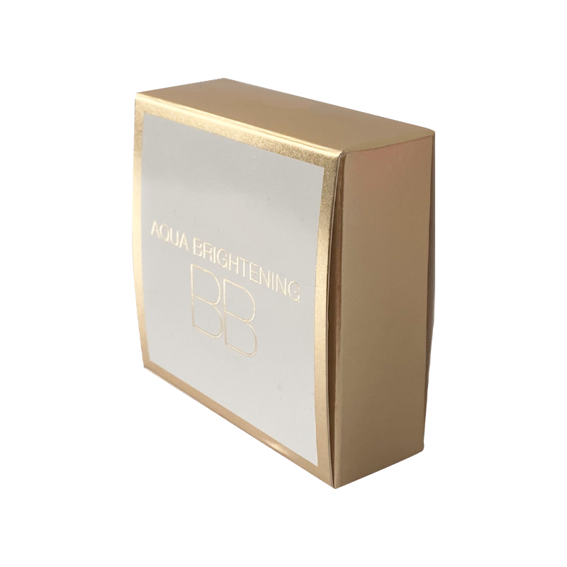 金卡纸bb霜包装盒微商定制双插盒烫金logo这是一款美妆产品的包装盒,采用金卡纸制作,表面闪闪发亮,logo也采用烫金的工艺制作,盒子可以折叠使用,支持定制免费设计