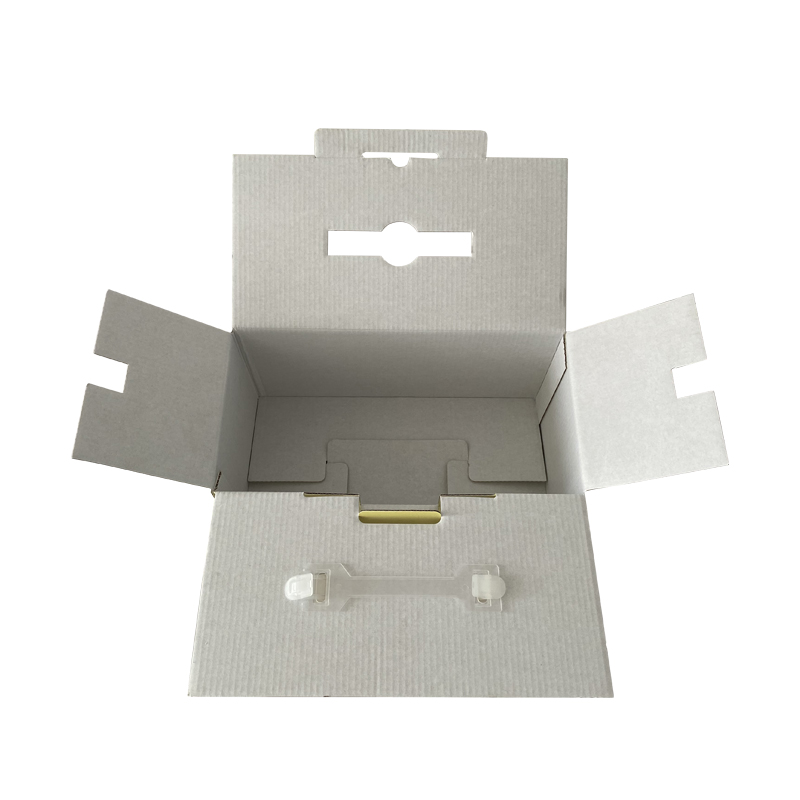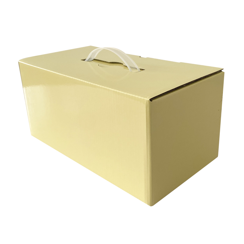 这款表面印刷黄色的手提瓦楞纸箱,表面采用特殊工艺让盒子防水防油,增加使用寿命,搭配透明的把手,方便携带使用, 支持定制免费设计